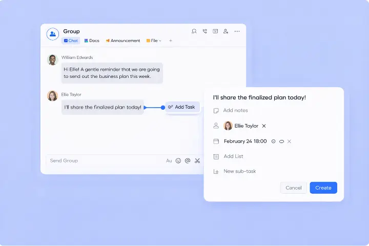 Dari sisi manajemen tugas, percakapan bisa langsung diubah menjadi task dengan deadline dan penanggung jawab. Progress dapat dipantau tanpa harus keluar dari aplikasi. Diskusi bukan hanya berhenti di kata-kata, tapi berlanjut menjadi aksi nyata.