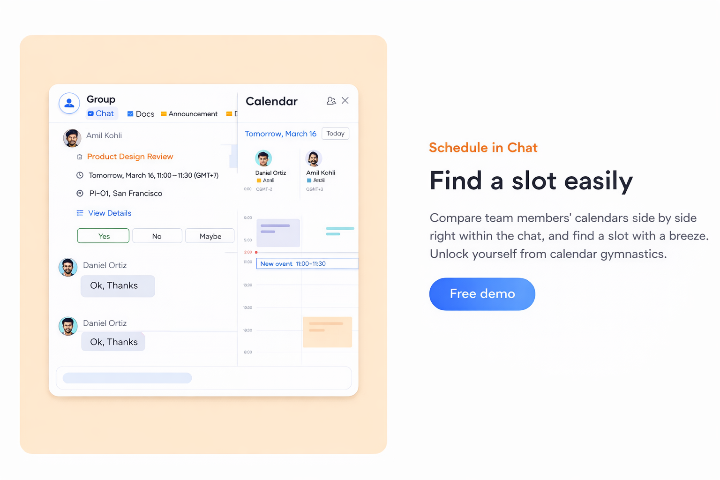 Kalender juga lebih terintegrasi. Meeting dapat dijadwalkan langsung dari chat dan otomatis masuk ke kalender semua peserta. Tidak ada lagi undangan tercecer, semua jadwal rapi dan sinkron.